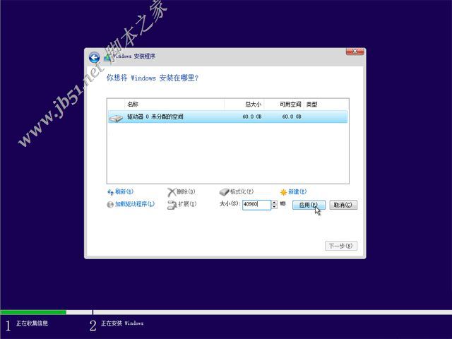 9、輸入要建立的分區大小,如果固態硬盤容量小,大小直接默認,點擊應用,建立一個分區,如果要2個以上分區,就自行設置大小,win10至少50G以上C盤空間,1G=1024MB,點擊應用;