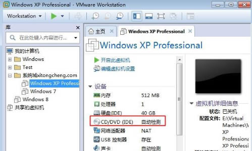 1.當我們需要在虛擬機安裝xp時,首先我們創建一個系統版本為xp的虛擬機,然后在左側窗口點擊xp,選擇“cd/dvd”選項。