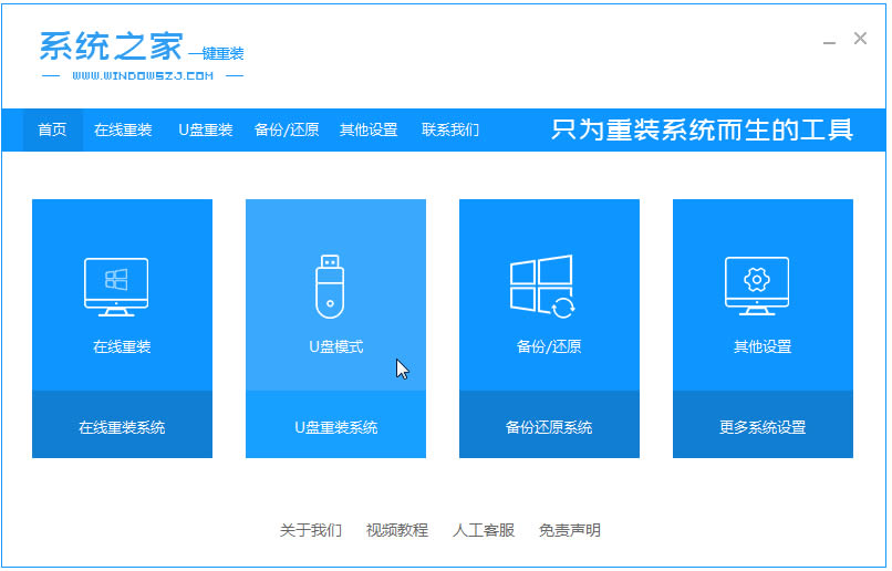 1.xp系統iso下載后如何安裝?首先我們下載一個“系統之家一鍵重裝系統”工具,然后在頁面中選擇”u盤模式“。