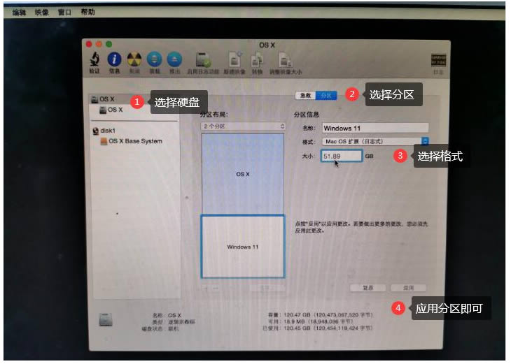 1、打開蘋果系統中的磁盤工具,按照圖示在電腦硬盤增加一個新的 Windows 11 安裝分區。