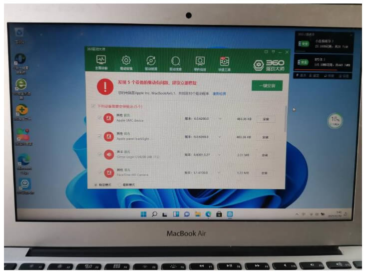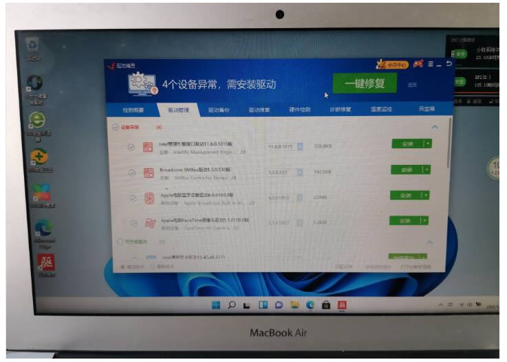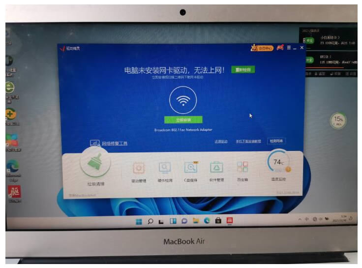 1、進入win11系統后如果無法上網,插上U盤,把下載備用的驅動精靈網卡版和驅動人生網卡版以及蘋果 Windows 驅動包拷貝到電腦中。安裝驅動精靈網卡版更新驅動,然后正常聯網并更新相關驅動。