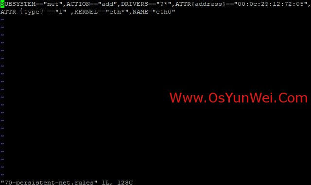 SUBSYSTEM=="net",ACTION=="add",DRIVERS=="?*",ATTR{address}=="00:0c:29:12:72:05",ATTR{type}=="1" ,KERNEL=="eth*",NAME="eth0"