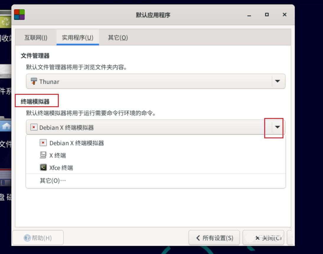 切換到【實用程序】選項卡,找到【終端模擬器】選項,點下拉按鈕,下拉菜單中單擊要設置的默認終端即可。