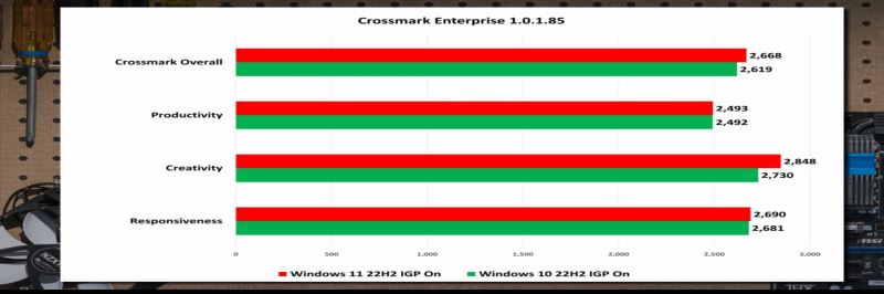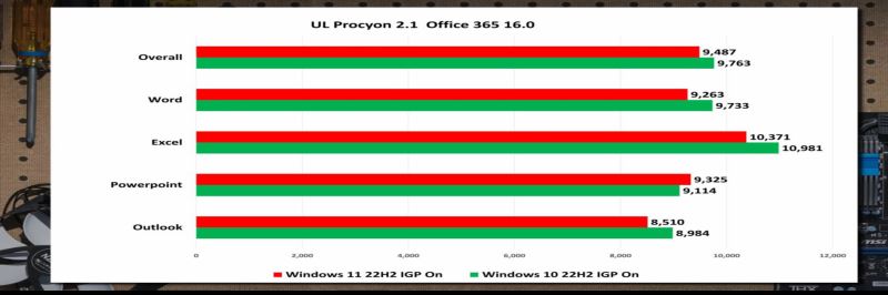 此外,還有 Chrome 107 測試,Procyon 的 Office 基準測試結果,以及 Bapco 的 Crossmark 企業測試。Office 365 中,Win10 在 Word、Excel、Outlook 中都比 Win11 快,綜合下來更勝一籌。