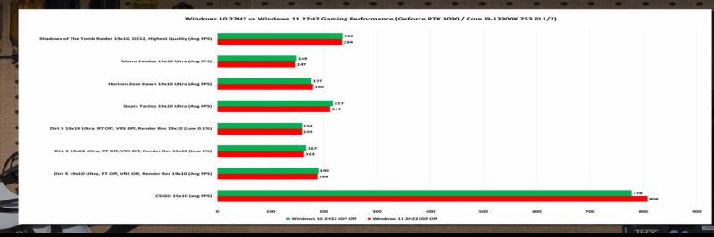 最后是游戲測試,結果顯示除了《反恐精英:全球攻勢》之外,兩個操作系統的性能幾乎相同,眾所周知這是一個只能在單線程模式下運行的游戲。