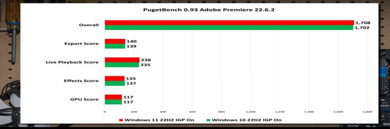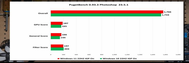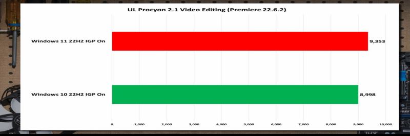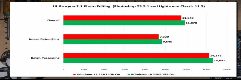 測試結果顯示,Windows 11 當然有表現更好的情況,但也有很多情況并非如此,Windows 10 也在相當多的情況下取得了領先。以下是在 PugetBench 和 UL 的 Procyon 中進行照片和視頻編輯獲得的基準數據。在 UL Procyon 中 Adobe Photoshop、Lightroom Classic 中,Win10 得分更高。