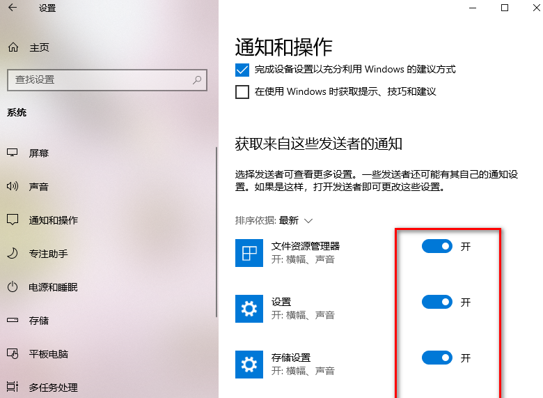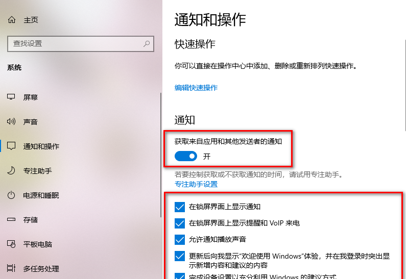 4.進入到通知和操作的頁面中,你可以看到在右側的頁面中【獲取來自應用和其他發送者的通知】功能是打開的,并且在下方有相關的一些通知選項都是自動勾選上的。
