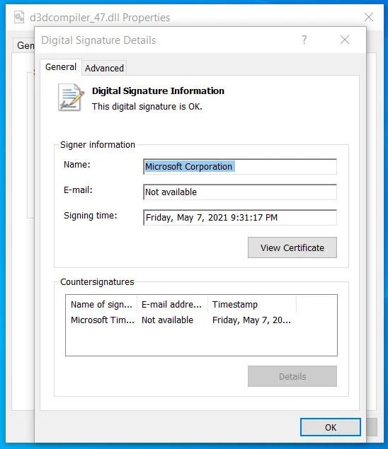 我們從報道中獲悉,其中一個 DLL 文件是微軟簽名的合法 DLL:d3dcompiler_47.dll,不過黑客修改了 DLL 以在文件末尾包含加密的惡意負載。
