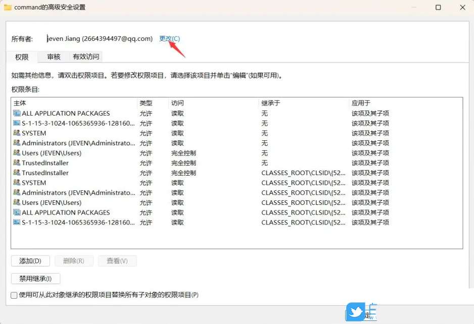 4、可以看到所有者默認(rèn)是【TrustedInstller】,然后點(diǎn)擊后面的【更改】,改成當(dāng)前使用的用戶;