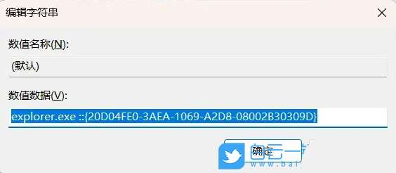 9、雙擊 (默認(rèn)) 項(xiàng),將默認(rèn)字符串?dāng)?shù)據(jù)改為下面的值【explorer.exe ::{20D04FE0-3AEA-1069-A2D8-08002B30309D}】,并點(diǎn)擊【確定】;