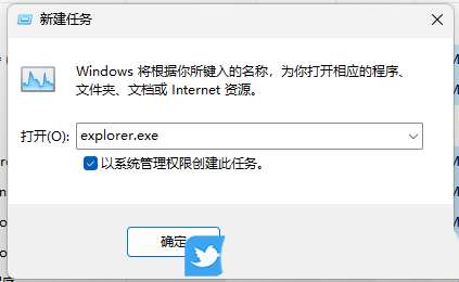 5、新建任務(wù)窗口,輸入【explorer.exe】命令,按【確定或回車】,即可重新啟動(dòng)Windows 資源管理器(建議勾選以系統(tǒng)管理權(quán)限創(chuàng)建此任務(wù));