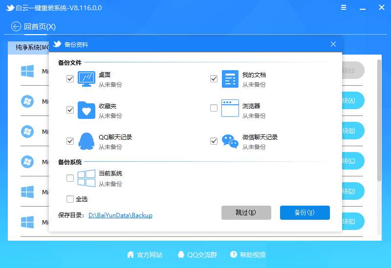 4、點擊安裝原版的Win10系統后,會提示是否備份資料,備份文件支持【桌面/我的文檔/收藏夾/瀏覽器/QQ聊天記錄/微信聊天記錄】,以及備份【當前系統】,如果不需要備份,直接點擊【跳過】即可;
