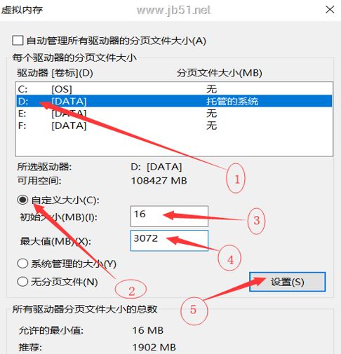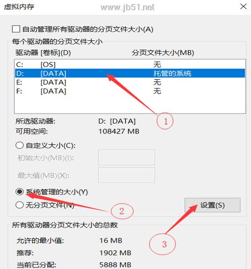 5、按照圖片的順序一步步弄好,此處創建的 pagefie.sys 文件與 C 盤的類似,自動分配大小,比較省事,手動分配大小的方法也會給出,二者根據個人喜好選擇其中一種就行了。