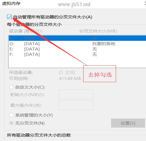 4、將默認勾選的“自動管理所有驅動器的分頁文件大小”選項取消。