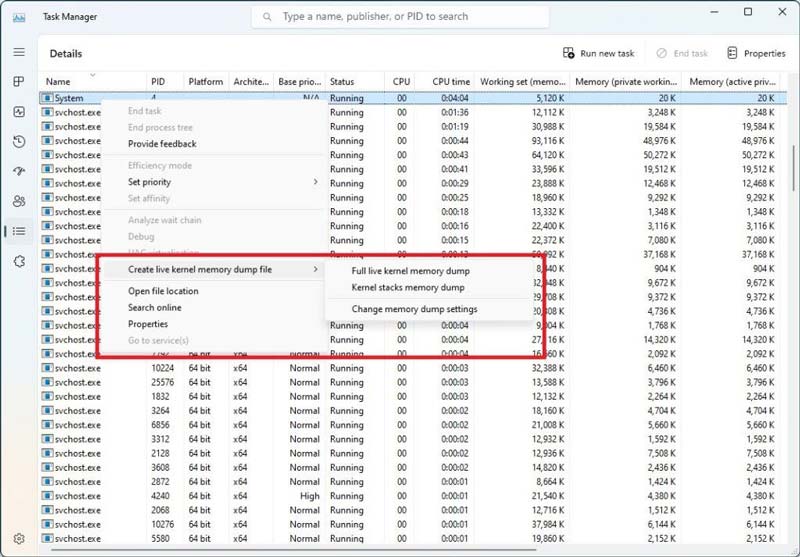 在任務管理器的詳細信息頁面上右鍵單擊進程時,選擇新的“創建實時內核內存轉儲文件”選項。
