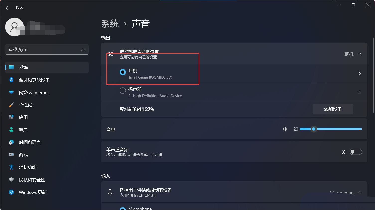 3、當前路徑為:系統 > 聲音,輸出下,選擇【耳機】;