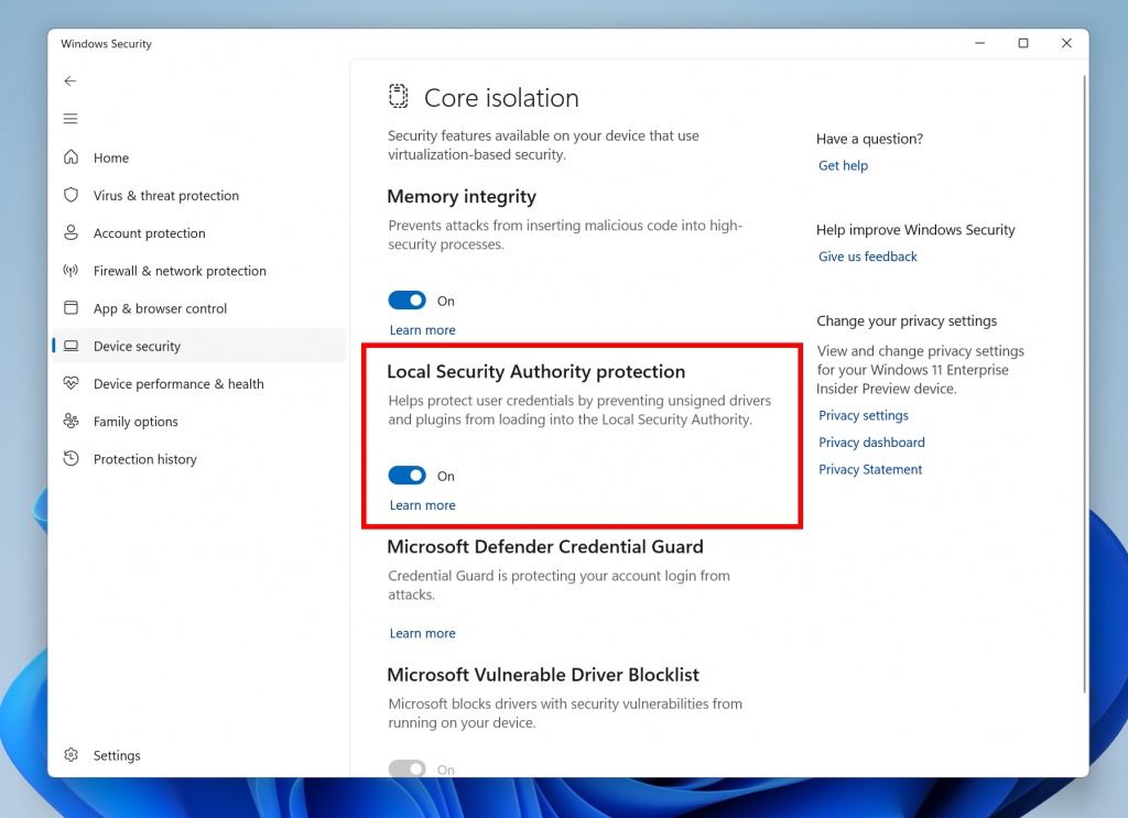 本地安全認證 (LSA) 保護通過防止未經(jīng)授權(quán)的代碼在 LSA 進程中運行以及防止進程內(nèi)存轉(zhuǎn)儲,幫助防止用于登錄的機密和憑據(jù)被盜。從升級開始,微軟將審計一段時間以檢查與 LSA 保護的不兼容性。如果沒有檢測到任何不兼容性,將自動打開 LSA 保護。用戶可以在設(shè)備安全性 > 內(nèi)核隔離頁面下的 Windows 安全應(yīng)用程序中檢查和更改 LSA 保護的啟用狀態(tài)。