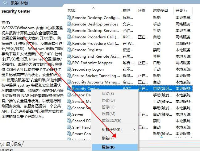 3、在打開的服務窗口中,找到Security p服務項,在彈出菜單中選擇“屬性”菜單項。