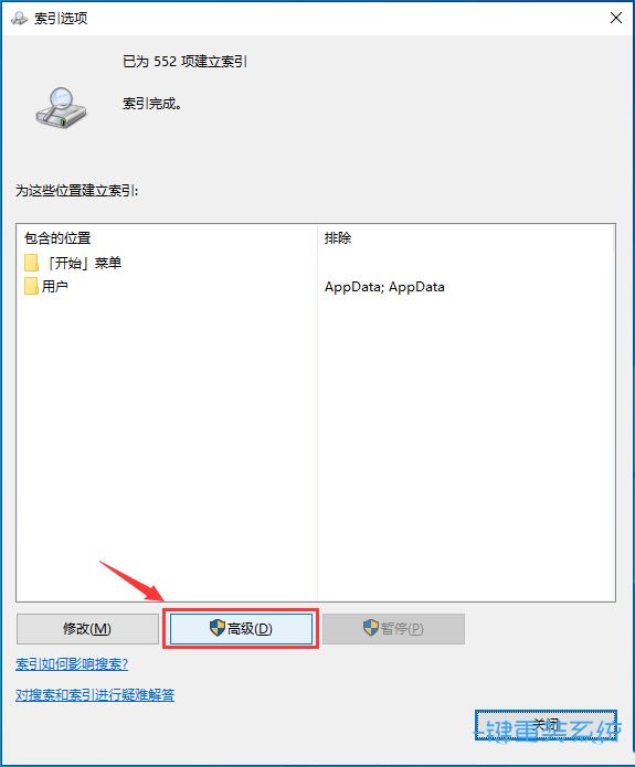 3、索引選項窗口,點擊底下的【高級】;