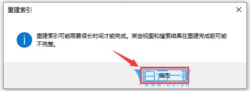 5、重建索引提示框,重建索引可能需要很長時間才能完成。某些視圖和搜索結果在重建完成前可能不完整。點擊【確定】;