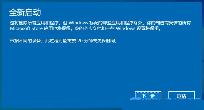 2、全新啟動,這將刪除所有應用和程序,但 Windows 標配的那些應用和程序除外。你的制造商安裝的所有 Microsoft Store 應用也將保留。你的個人文件和一些 Windows 設置將保留;
