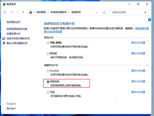 7、此時回到控制面板,退出并重新進入電源選項,看到“卓越性能”選項了,選擇該選項就好了。