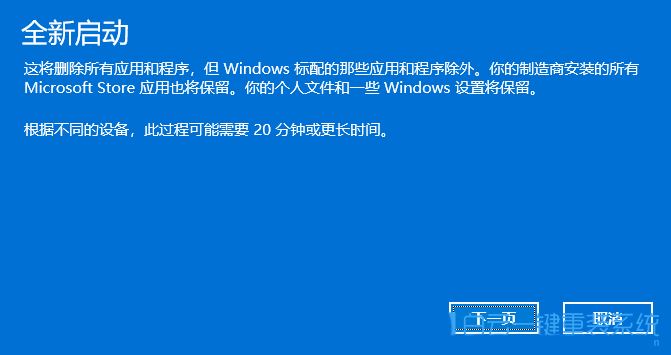 2、全新啟動,這將刪除所有應用和程序,但 Windows 標配的那些應用和程序除外。你的制造商安裝的所有 Microsoft Store 應用也將保留。你的個人文件和一些 Windows 設置將保留;