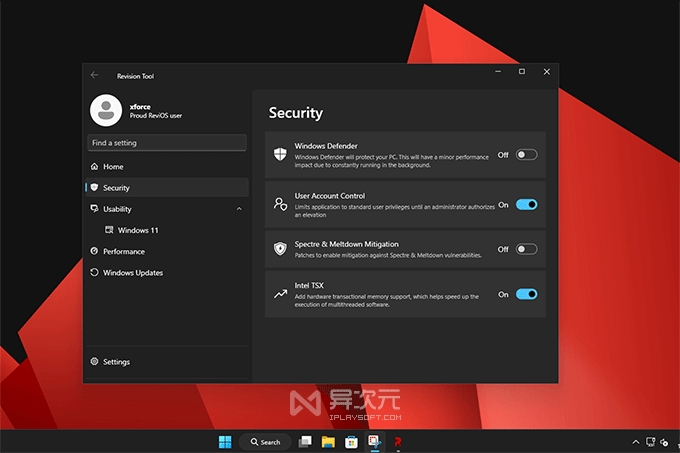 內(nèi)置 Revision Tool 優(yōu)化配置工具另外,ReviOS 還內(nèi)置了一個(gè)很有特色的「Revision Tool」工具,提供了一鍵開啟關(guān)閉 Windows Defender (系統(tǒng)自帶殺毒軟件)、開啟關(guān)閉 UAC 用戶賬戶控制、開啟禁用 Intel TSX 指令集,以及一些性能優(yōu)化、系統(tǒng)更新等功能。
