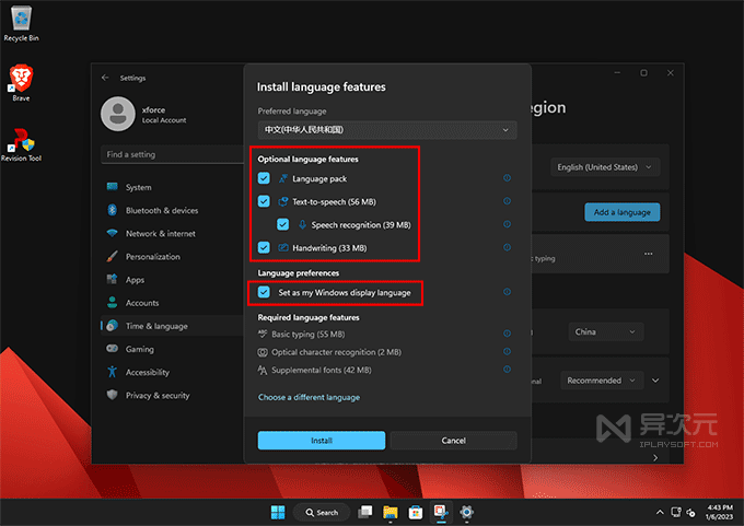 5、注意這里必須勾選上 Set as my Windows display language (設(shè)置為系統(tǒng)顯示語言) 的選項(xiàng),如下圖:語言包、TTS 發(fā)聲、語音識(shí)別、手寫等 4 個(gè)選項(xiàng)也最好全勾選上。點(diǎn)擊 Install 按鈕開始下載與安裝。