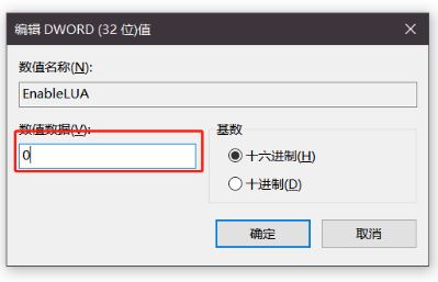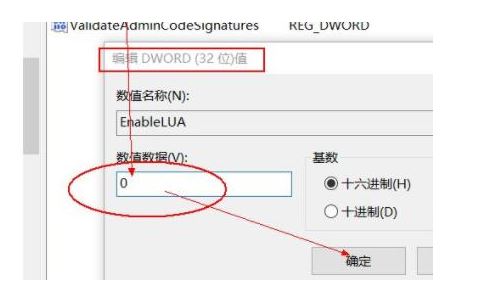 2、在右側找到“EnableLUA”項,雙擊“EnableLUA”項,在彈出的窗口中,將數據數值 1 更改為 0,點擊確定退出注冊表編輯器。