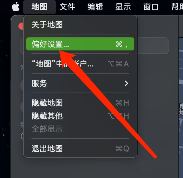 打開Mac系統地圖的下拉菜單,點擊偏好設置。