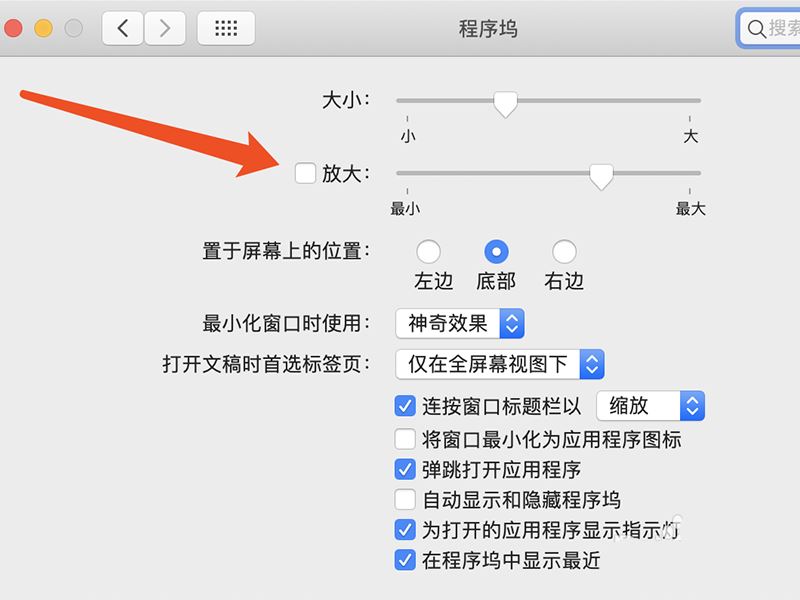 在程序塢的頁面中,點擊放大前面的方框,選中這個效果