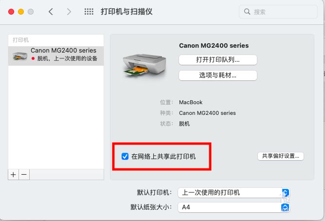 在打印機與掃描儀頁面,取消【在網絡上共享此打印機】設置。
