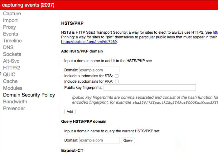 3、然后我們在瀏覽器輸入“chrome://net-internals/#hsts”指向瀏覽器參數設置界面,有些瀏覽器可能不支持這個頁面,我們可以使用谷歌瀏覽器打開。