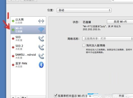 3、選擇點擊左邊的“互聯網”,然后選擇右邊的wifi,如果右邊不是顯示的wifi而是airport就選“airport”。