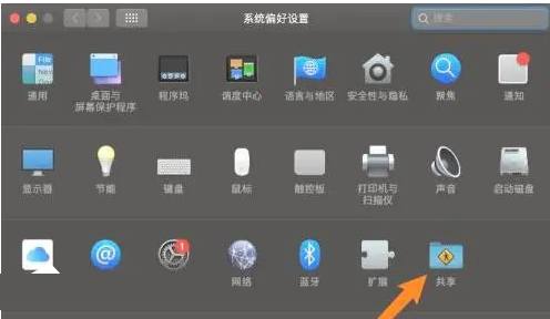 2、在系統偏好設置界面找到“共享”打開。