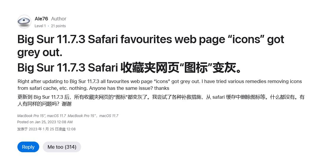 蘋果上月發布 macOS Big Sur 11.7.3 更新之后,受影響的用戶已在 Apple 支持社區、Twitter、Reddit 和其他在線平臺上抱怨這個問題。