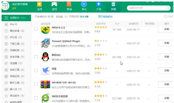 2、打開“360軟件管家”,點擊上方的卸載,自動掃描軟件后,全部軟件將呈現(xiàn)出來。