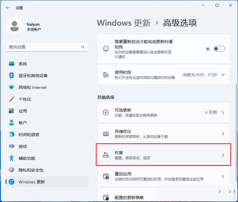 3、當前路徑為:Windows 更新 > 高級選項,然后點擊其他選項下的【恢復(重置、高級啟動、返回)】;