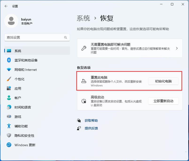 4、當前路徑為:系統 > 恢復,點擊恢復選項下的【重置此電腦,選擇保留或刪除個人文件,然后重新安裝Windows旁的[初始化電腦]】;