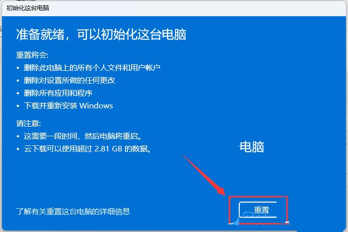 9、準備就緒,可以初始化這臺電腦,確定沒有問題,直接點擊【重置】;