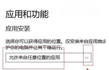 4、在應用和功能設置頁面,我們可以看到應用安裝下面的設置是允許來自任意位置的應用。章的設置就會導致電腦可能會自動安裝一些軟件。