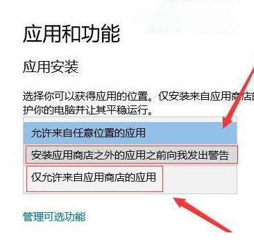 5、我們點擊后面的下拉菜單按鈕,然后可以選擇安裝應用商店之外的應用之前向我們發出警告或者是。僅允許來自應用商店的應用。