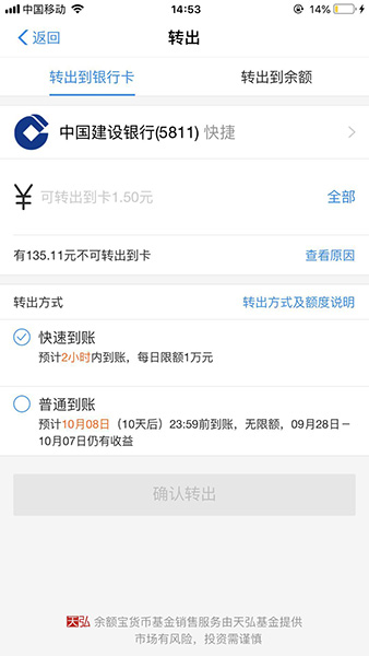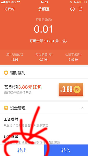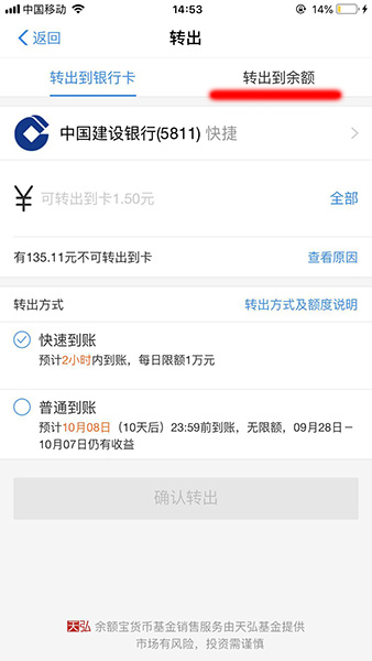 3、轉出的時候需要注意的是選項,首先需要將錢轉出到支付寶余額中,點擊右上方的【轉出到余額】