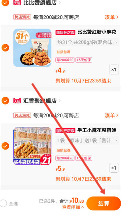 我們打開淘寶軟件,然后我們點擊購物車中的結算,注意要選擇多個產品。