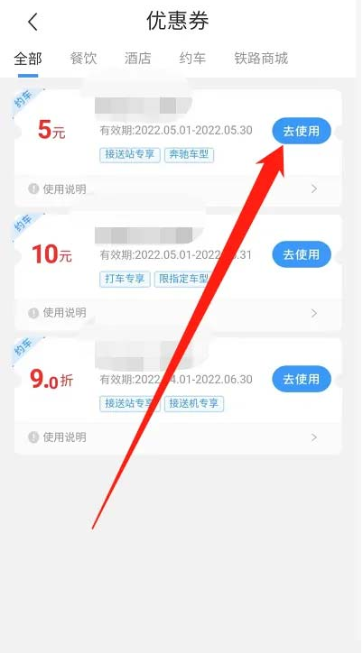 之后選擇優惠券,點擊【去使用】即可。如圖所示