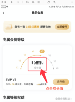 在【會員中心】,點擊【專屬會員等級】中的【成長值】,如圖所示。
