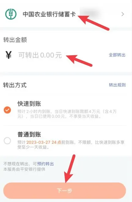 接著進入轉(zhuǎn)出界面,選擇到賬的銀行卡,然后輸入轉(zhuǎn)出金額,點擊下一步就可以提現(xiàn)了。