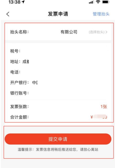 在這里確認發票抬頭及信息,確認無誤后點擊提交申請;