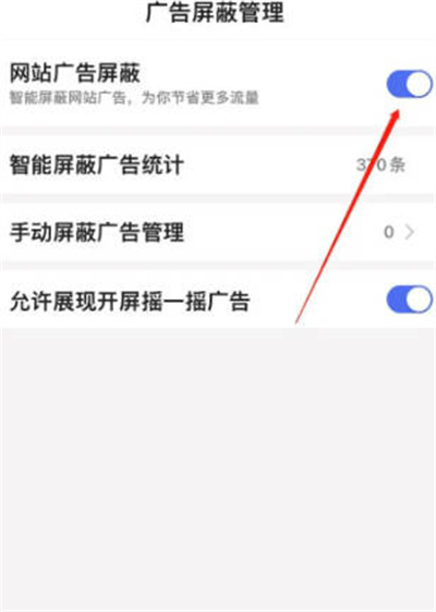 我們點擊了廣告屏蔽管理之后,就會進入一個頁面中,我們點擊網站廣告屏蔽功能右側的滑塊開啟即可。